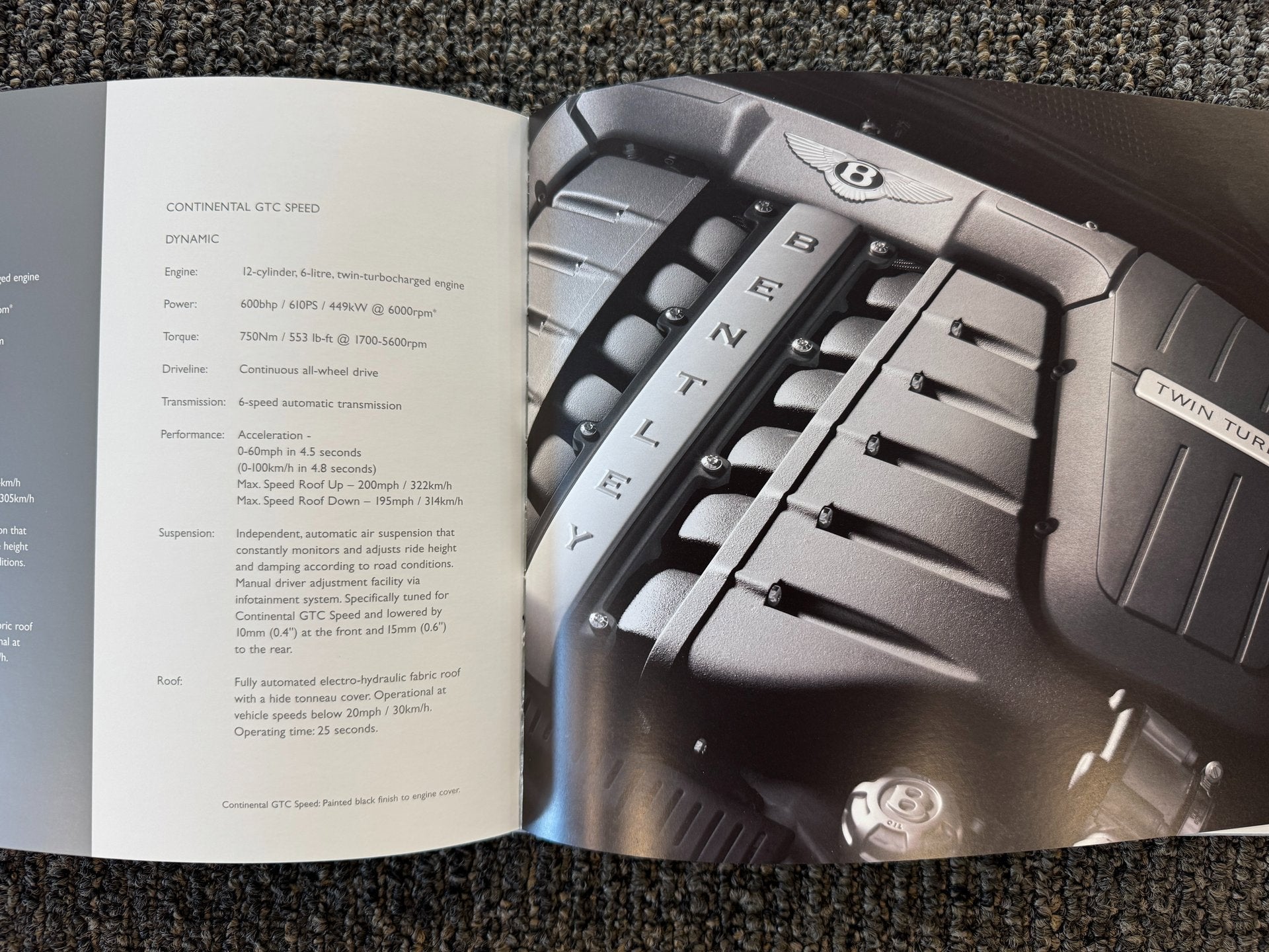 The 2010 Bentley Continental GTC Speed W12 is a high-performance convertible featuring a 6.0-liter twin-turbocharged W12 engine producing 600 horsepower and 553 lb-ft of torque, paired with a 6-speed automatic transmission and all-wheel drive. The GTC Speed also includes a lowered and retuned suspension with a recalibrated stability control, according to Car and Driver. The Speed model is a swankier, even more powerful version of Bentleys Continental GTC convertible. 2010 Bentley Continental GTC Speed W12 6.0L W12 Twin Turbocharged ZF 6-Speed Automatic with Tiptronic Onyx Continental GTC Speed W12, 2D Convertible, 6.0L W12 Twin Turbocharged, ZF 6-Speed Automatic with Tiptronic, AWD, Front Seat Lumbar Massage, Fully Adjustable Electric Leather Bucket Seats w/Memory, Heated front seats, Power Boot Opening and Closing, Rear-View Camera.